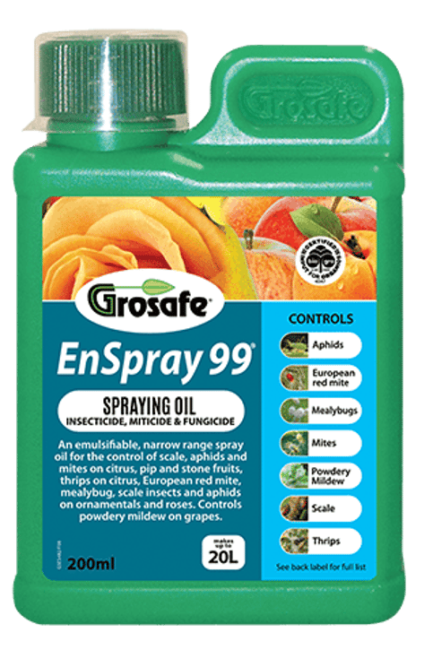 EnSpray 99Spray oil for the control of powdery mildew, scale, aphids, mites, thrips, European red mite, mealy bug, scale insects and aphids on ornamentals and roses.