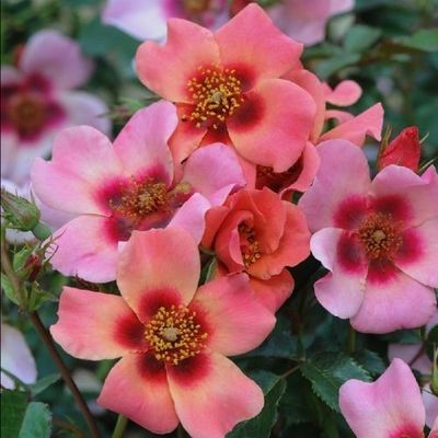 A striking floribunda with rich sunset shades of pink, apricot and peach, another persica hybrid with a distinctive purple eye. This nicely fragrant roe flowers continuously throughout the season. Tidy compact bush that shows good health. UK Rose of the Year 2015.