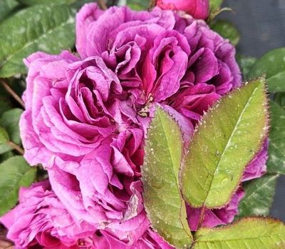 Deep red flowers with darker, purplish shadings. Quartered flowers, fragrant and recurrent. 1 m