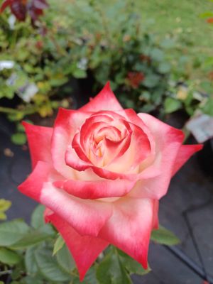 Stunning white blooms splashed with red and silvery reverse. Perfect form, ideal for picking. Mild scented. Repeat flowering